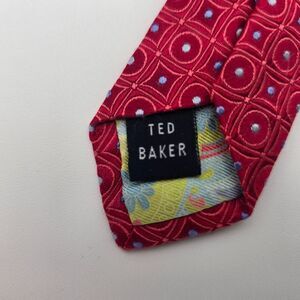 Premium silk tie from Ted Baker London, featuring a bold red geometric pattern with blue dot accents and a contrasting floral keeper loop on the back — a signature Ted Baker design detail. Crafted in the USA from 100% silk, this tie blends classic British flair with modern craftsmanship. Its extended 62” length makes it ideal for larger knots or taller wearers. Ties are rolled and placed in plastic bags and shipped in bubble mailers for protection. Wrinkles may form in shipping, and ironing may be required upon receipt.