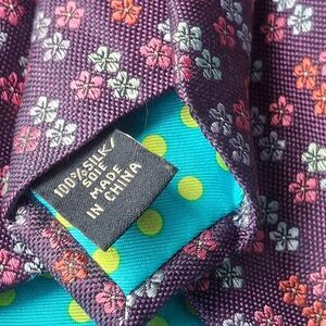 Sophisticated and playful, this Ted Baker London silk tie features a rich purple base with a jacquard floral pattern in pink, red, and blue. Inside, the signature Ted Baker detail shines through with a turquoise lining accented by lime green polka dots.