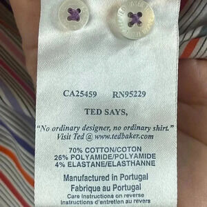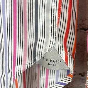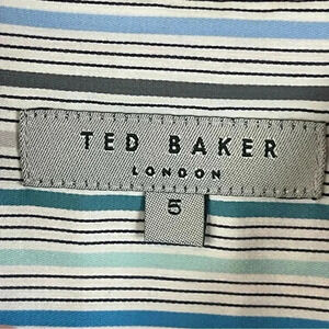 Men's Ted Baker London Long Sleeve Button Down Shirt Size 5 which is equal to a US XL. Multicolor Striped made of Cotton, Polyamide & Elastane. Great for any occasion. Gently Used, please see picture's for details.