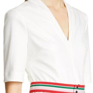 Detail Description: striped elastic belt complements the elegant feathered friends on this midi-length sheath dress tailored with elongated sleeves and a pleated V-neck.Exposed back-zip closure