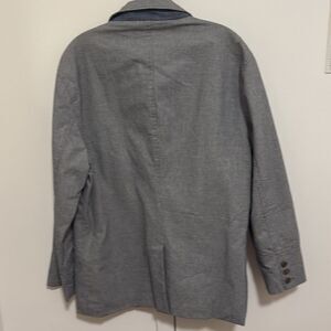 Ted Baker London NWT Rock the boat Mens’ washed cotton blazer in navy micro houndstooth pattern. Features 3 button closure, buttoned chest pocket, 2 front buttoned pockets, 2 internal pockets, back vent, peaked lapel, 3 buttons on cuff and fun lining. Signature buttons sewn on with red thread.