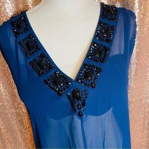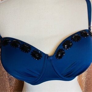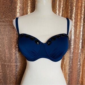 Preowned Ted Baker London navy blue swim cover up bikini top in size 36DD/E. Sheer material with gem stone details.