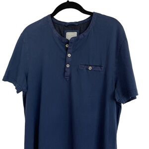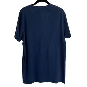 Navy blue short sleeve tee from Ted Baker London. Three button placket and a slit button pocket on the chest. Size 4, which is a size Large (see attached size chart). 100% cotton and in great preowned condition; a bit of fading on the shoulder (see last pic) but barely noticeable.