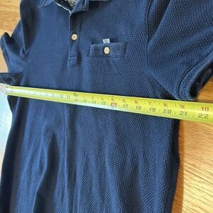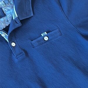 Ted Baker navy blue polo shirt. Waffle pattern. Tan colored buttons, ribbon. Detail on the collar. Excellent condition. Only worn a few times. Ted Baker size 4.