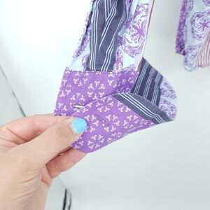 Ted Baker London Purple Striped Mixed Print Collared Button Up Shirt Cotton Long Sleeve Men's 42. Fair used condition, everything is really good except there are some sweat (maybe?) stains on both cuffs at the fold and there are some small bleach stains on the bottom of the front of the shirt in the middle. Flaws photographed in last two pics. I believe this shirt requires cuff links.