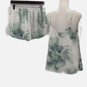 Ted Baker London Satin Cowl Cami & Short Pajama Set in Magnolia - Size Large. Excellent pre-owned, like new condition. The little gold brand plate came loose on one side (on the top) and I just stitched it back on, good as new now. Delicate lace sweetly frames the cowl neckline of a floral print pajama set that pairs a camisole with matching shorts.