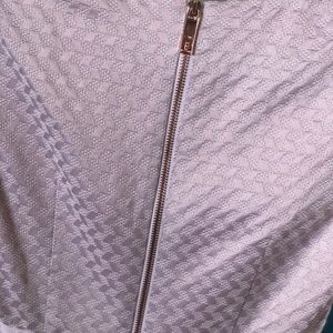 Rose Gold Zipper detailing on back, perfect length. Adorable pleating and belt line is super flattering.