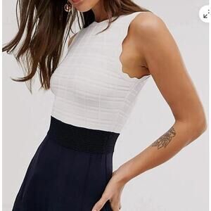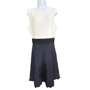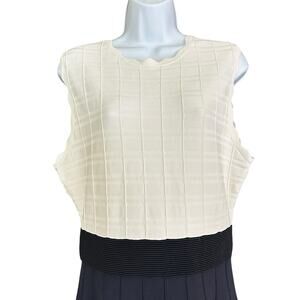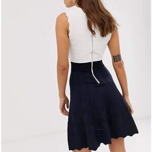 Elegant Ted Baker sleeveless dress featuring a cream textured knit bodice, wide ribbed navy waistband, and navy skirt with subtle perforated stripe detailing. Crafted in a stretch knit blend for structure and comfort. Gold-tone back zip closure. A timeless silhouette that works beautifully for office wear, dinner dates, or special occasions.