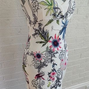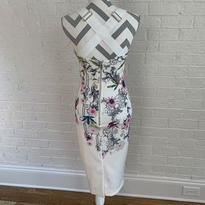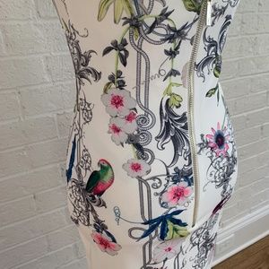 Ted Baker London size 1- White fitted, below the knee cocktail dress. This dress has beautiful floral and bird design on 3/4 of the dress. It has unique adjustable straps. This dress is in great condition.