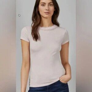 Ted Baker This elevated stretch-knit tee boasts a delightful neckline, complete with pleated grosgrain, ruffled tulle and polished beads.