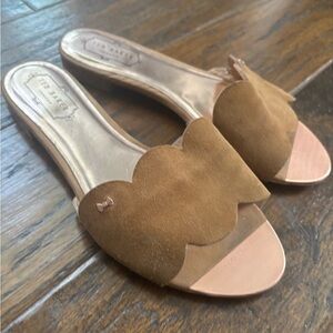 Ted Baker London dressy suede tan scalloped flat sandals size 38.5 8