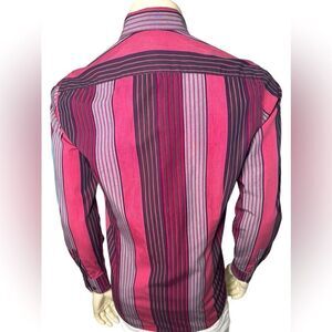 This VERY unique casual long sleeved shirt by Ted Baker is in wonderful condition and features various size stripes in pink, black, eggplant, navy, maroon, white and red with maroon buttons. It’s 100% cotton and the size 3 measures as follows: