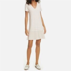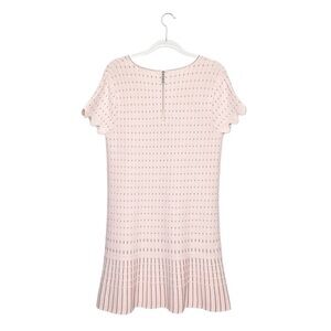 Style Description: Jacquard sweater-dress | V-neck | Scalloped short sleeves | Exposed back-zip closure | Dropped waist | Flounced hemline hits just above the knee | Unlined | Hand wash, dry flat