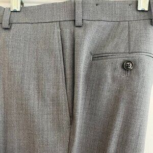 Classic, dress pants in brownish gray. Unlined. No size/materials tag. Waist laid flat, side to side is about 18 inches with inseam approx 35 inches. Very good condition.