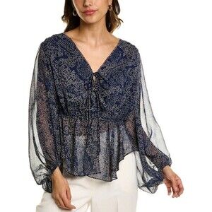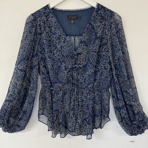 Ted Baker Mildred Blouse Balloon Sleeve Navy Beige Peasant Sheer Top Size 2 US 6