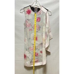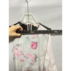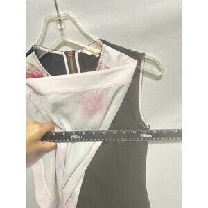 The Ted Baker Milisa Pure Pony Tunic Dress in size 0 is a floral sleeveless dress with a round neckline and a zip closure. Made from a blend of polyester, polyamide, viscose, and elastane, this multicolor mini dress features a flowing front scarf panel and stretch material for comfort and style. Perfect for weddings and parties, this Ted Baker dress combines elegance and fashion in a unique and eye-catching design.