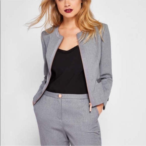 Tailored jacket features pared-down grosgrain bows, a pretty peplum and finishes with Ted Baker London's signature rose gold zipper.