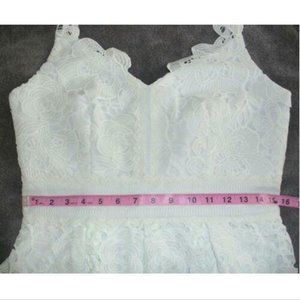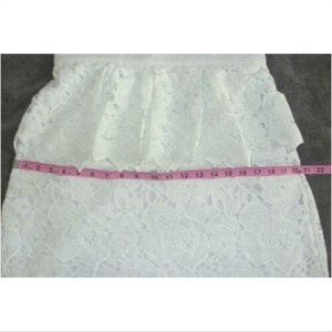 A beautiful floral embroidered lace dress features textured trim, stitched details, and peplum styling perfect for fancy occasions.