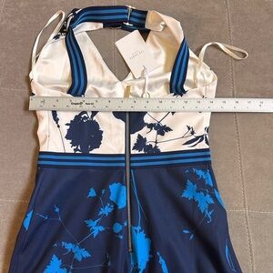 Elegant Ted Baker dress with a sophisticated floral pattern. Features navy and cream hues.