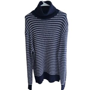 Stylish turtleneck sweater. Features navy and white pattern. Perfect for cool weather.