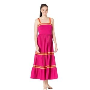 Elevate your wardrobe with this vibrant maxi dress from Ted Baker. Designed in a striking fuchsia pink, this dress features eye-catching yellow striped accents for a playful yet chic contrast. The tiered, flowy skirt and fitted bodice create a flattering silhouette that offers comfort and style. Adjustable shoulder straps provide a customized fit, perfect for warm-weather events, beach days, or casual outings. Lightweight and breathable, this dress seamlessly blends elegance and fun for any occasion.