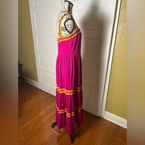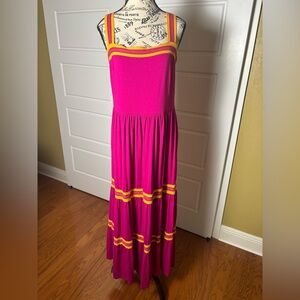 Ted Baker, fuchsia maxi dress, women's summer dress, mustard yellow accents, tiered skirt, adjustable straps, pre-owned designer dress, vibrant summer wear, breathable fabric, Ted Baker pink dress.