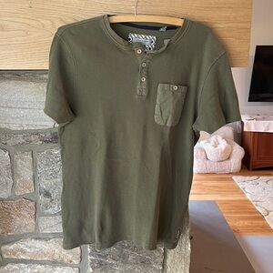 Chic olive green button-up shirt. Features a unique patterned inner collar. Ideal for casual outings.