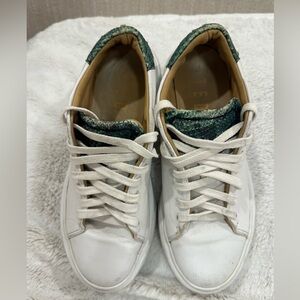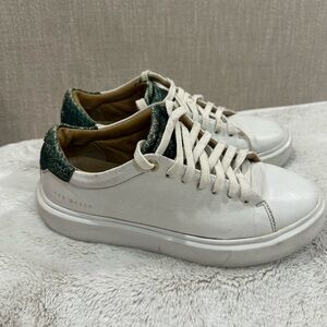 Elevate your footwear game with the Ted Baker PIXIIE Trainers. Crafted from premium leather, these sneakers are designed to make a statement. Featuring bold chunky soles and unique snake-effect embossing on the tongue and tips, they combine comfort with standout style. Finished in a fresh white and green colorway, these size 8 sneakers are the perfect fusion of fashion and function.