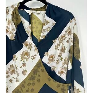 Features a tailored fit with a fun floral and geometric design. V-neckline with long sleeves, a front wrap and side button closure.