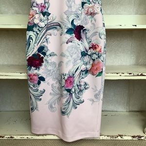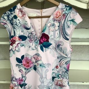Lovely Ted Baker pink dress with floral print. Soft, silky material with a bit of stretch. Pretty rose gold zip closure in back. Knee-length. There is one small stain on the very bottom of the dress, I tried a few times to get it out but was unsuccessful. Not really noticeable when wearing. Otherwise this dress is in very good condition. Size 4. Brand is Ted Baker London.