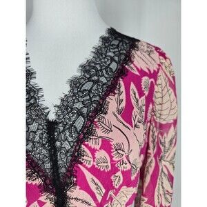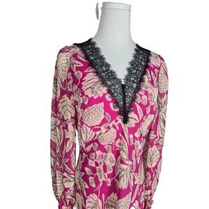 Elegant pink midi dress with floral pattern. Features black lace trim. Long sleeves and V-neckline.