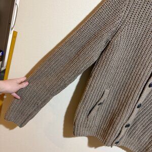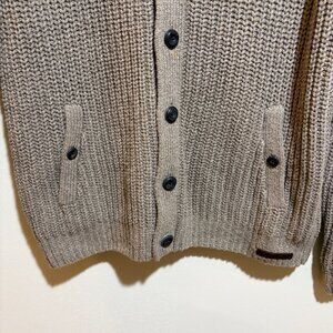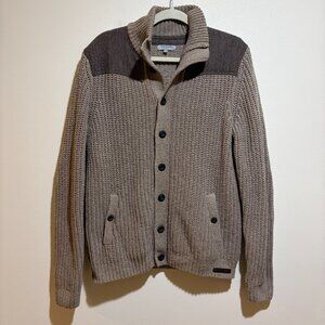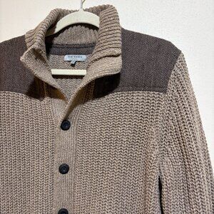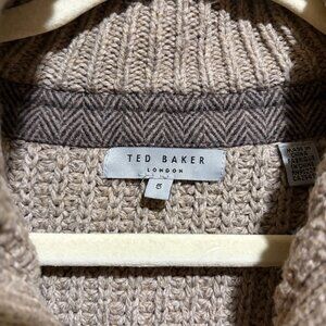 Ted Baker Princiz Herringbone Cardigan Sweater Jacket. Tan with brown herringbone panel. Mock neck. Brown herringbone pattern elbow patches. Front pockets. Button up front.