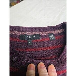 Ted Baker pullover sweater men's size 6/Large long sleeve purple with red stripes. Cotton, nylon, and wool blend. Logo at bottom left front. Elbow patch details.