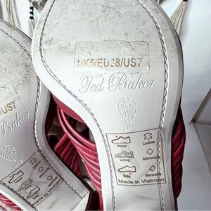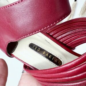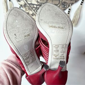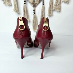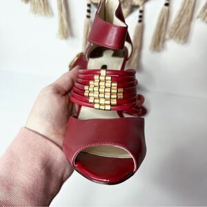 Red leather peep toe heels with oversized gold zipper on back and layered with gold beading on front, around ankle. Some slight spots on one toe, pictured. Excellent used condition!