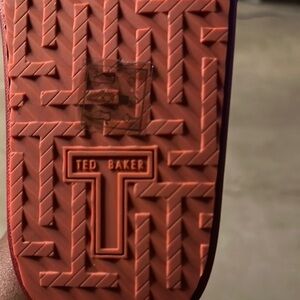 Stylish red slide sandals. Embossed Ted Baker logo. Comfortable and sleek design.