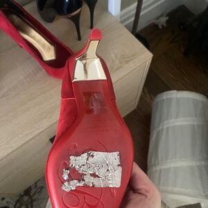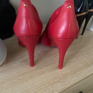 Red suede heels in great condition and only worn once! Minor scuffs on sole. Runs slightly small for size. Leather upper and lining.