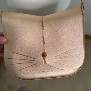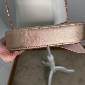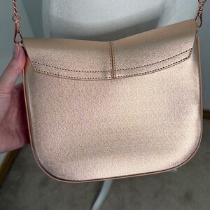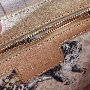 Stylish metallic gold bag with animal print. Features a secure zipper closure. Ideal for a trendy look.