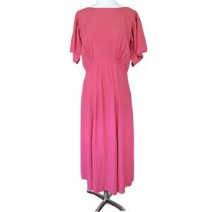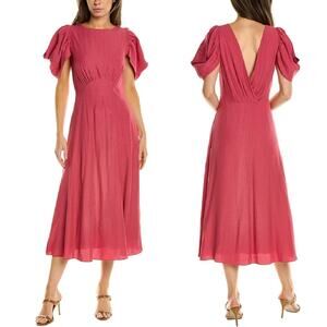 Chic rose midi dress. Features stylish puff sleeves and elegant V-back. Ideal for versatile wear.