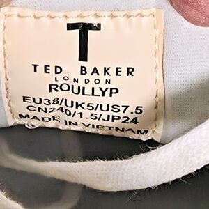 The NEW Ted Baker Roullyp Floral-Graphic Leather Sneakers in ladies size 7.5 offer a stylish and comfortable option for women. With a lace-up closure and low top shoe shaft style, these sneakers feature metal bows on laces, studded accents, metal logo plaques on heels, and floral accents. Retail $165. Made of leather with a rubber outsole, they provide arch support, cushioning, and are lightweight and padded for comfort. The white sneakers with floral pattern and colorful accents are perfect for various occasions and seasons, making them a versatile addition to your shoe collection.