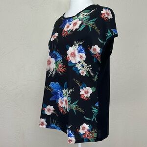 Ted Baker Sammer Jamboree Floral Front Top in black. Size 2 Ted Baker which is a size small US. Really beautiful tropical flower pattern at the front, and a soft solid black knit back. Cap sleeves. Gently used. First image is not mine but stock for reference.