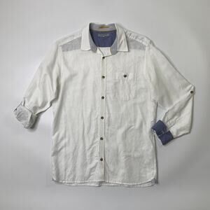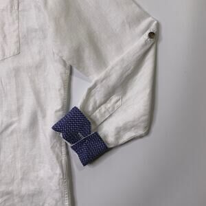 Ted Baker Shirt Mens 3 White Blue Linen Blend Flip Cuff Tab Sleeve Button Up