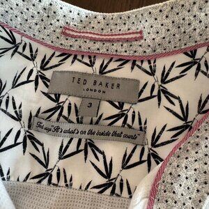 A very cool (literally and figuratively) shirt from Ted Baker in 65% Lyocell, 35% Cotton. Shirt is white and features a Mandarin collar as well as all manner of unique touches, like pink button thread, subtle patterns on the button placket and hem gussets. Some is Mens Small (UK Size 3) with slimming darts in the back. There are also little mini button plackets on the sleeves. The material features a nearly diamond-like dobby pattern, but it’s actually a square grid rather than diamonds. Fabric is super breathable and comfortable.