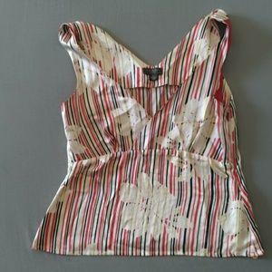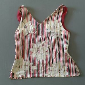 White, black, red striped silk blouse with flower detail. Side zipper works well. 100% silk with polyester lining