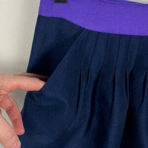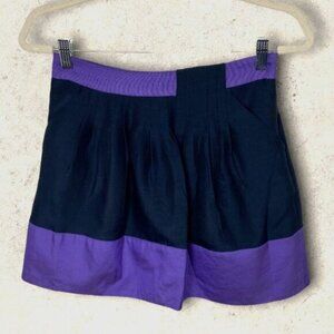 Ted Baker Elbert Colorblock Mini Skirt in Purple and Navy Blue. Women's size XS (or Ted Baker Size 1). Pleated front detail. Lined with tule. Cotton and silk. Side zipper. Made in China. Dry clean. Very good pre-loved condition. No visible flaws.