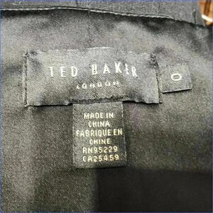The Ted Baker Sleeveless Bodycon Dress is a knee-length cocktail attire for women. It features a V-neckline and a zip closure with accents of a zipper. The dress is made of woven polyamide, viscose, and elastane fabric with a solid pattern in black color. It is lined and stretchable, suitable for summer, fall, and spring seasons. The dress is not handmade and requires dry clean only. The brand is known for its modern and designer style with American and London themes. The size is 0/US 2, and the length is 38". Pit to Pit: 14.75". Excellent condition.