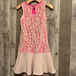 Sleeveless bronze pink dress with delicate cream floral lace overlay. Keyhole button neck closure. Drop waist. Preowned. Girls size 8