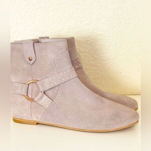 Love these updated moccasin for a modern look. The rose gold buckle and studs are a special detail. Has a light lavender gray suede. Like new no box. Questions? Leave a comment below!