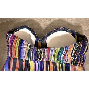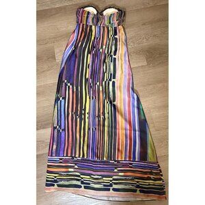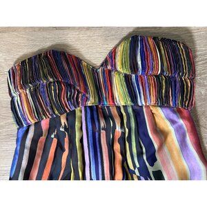 Stand out effortlessly with this strapless maxi dress. Its vibrant multicolor stripes and flowy silhouette create a bold yet elegant statement.