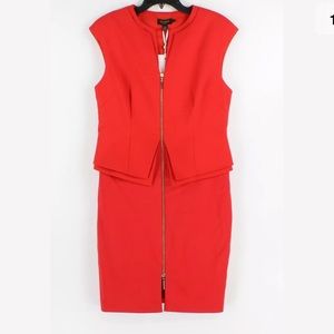 FIRM PRICE. Ted Baker London Women's sz 4 = US 12 Jamthun Dress Structured Peplum Zip Sheath Red with Tag $315 Split neckline Padded shoulders slit hem Exposed front zip closure Dry clean Stretches Approx measurements laying flat: pit to pit - 19" waist - 17" hips - 19.5" total length on the back - 39" Please see all measurements as brands may have size variances Career, formal event, career, business, cocktail, wedding, party, holiday