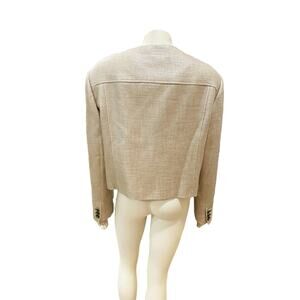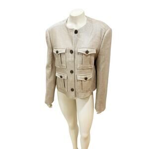 Cargo pockets bring utilitarian detail to this cropped jacket that is made from a coarsely woven fabric with a touch of cool cotton and breezy linen. Jewel neck 56% viscose, 24% linen, 20% cotton Dry clean Made in Turkey